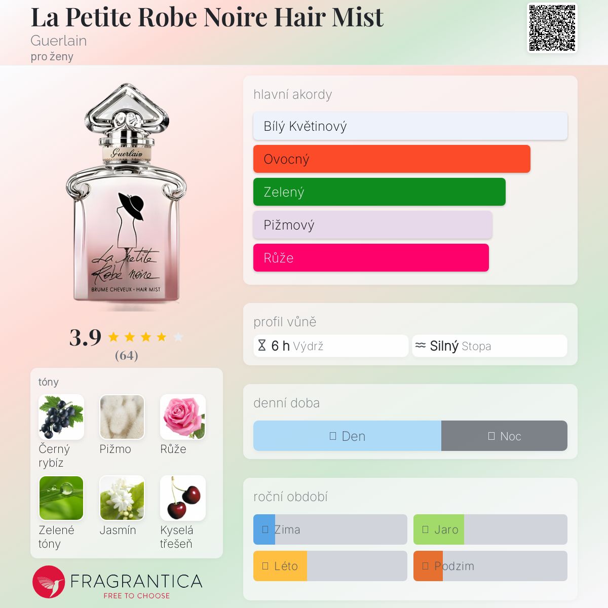 La Petite Robe Noire Hair Mist podle Guerlain je Floral Fruity vůně pro ženy. La Petite Robe Noire Hair Mist byl/a uveden/a v roce 2014. "Nosem" za touto vůní je Thierry Wasser. Vrchní tóny jsou Černý rybíz a Kyselá třešeň; střední tóny jsouRůže, Zelené tóny, Jasmín a Pomerančový květ ; základní tóny jsou Bílé pižmo a Bílý jantar (ambra).