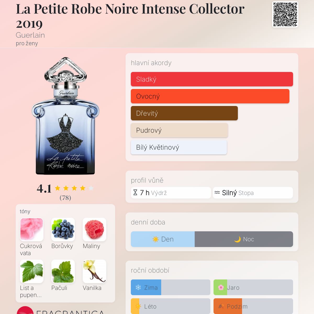 La Petite Robe Noire Intense Collector 2019 podle Guerlain je Floral Fruity Gourmand vůně pro ženy. La Petite Robe Noire Intense Collector 2019 byl/a uveden/a v roce 2019. "Nosem" za touto vůní je Thierry Wasser. Vrchní tóny jsou Cukrová vata, Borůvky, Maliny, Černý rybíz a Limetka; střední tóny jsouJasmín, Pomerančový květ a Bulharská růže ; základní tóny jsou Pačuli, Vanilka, Pižmo a Santalové dřevo.