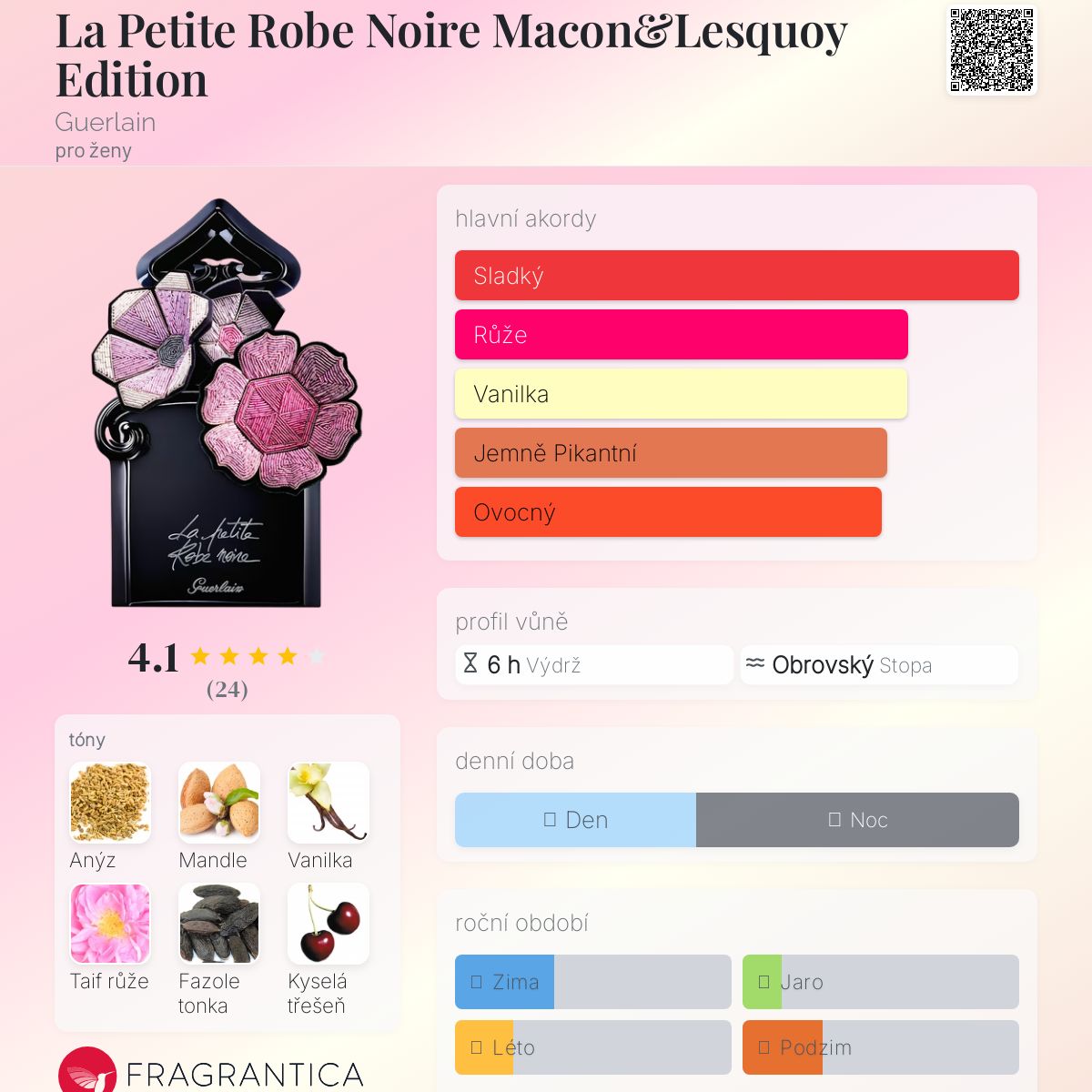 La Petite Robe Noire Macon&Lesquoy Edition podle Guerlain je Orientální Vanilla vůně pro ženy. La Petite Robe Noire Macon&Lesquoy Edition byl/a uveden/a v roce 2014. "Nosem" za touto vůní je Thierry Wasser. Vrchní tóny jsou Mandle, Kyselá třešeň, Červené bobule a Bergamot; střední tóny jsouTaif růže, Černá růže, Lékořice a Černý čaj ; základní tóny jsou Anýz, Vanilka, Fazole tonka, Kosatec a Pačuli.