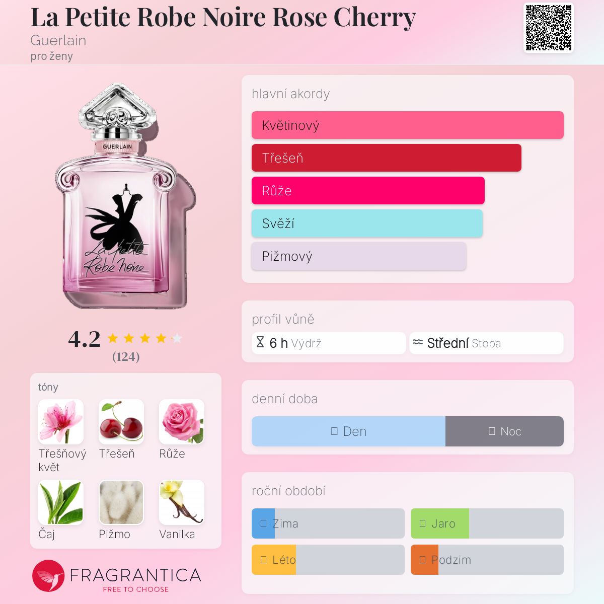 La Petite Robe Noire Rose Cherry podle Guerlain je Floral Fruity vůně pro ženy. La Petite Robe Noire Rose Cherry byl/a uveden/a v roce 2023. "Nosem" za touto vůní je Delphine Jelk. Vrchní tóny jsou Třešňový květ a Bílý čaj; střední tóny jsouTřešeň, Bulharská růže a Turecká růže ; základní tóny jsou Bílé pižmo a Vanilka.