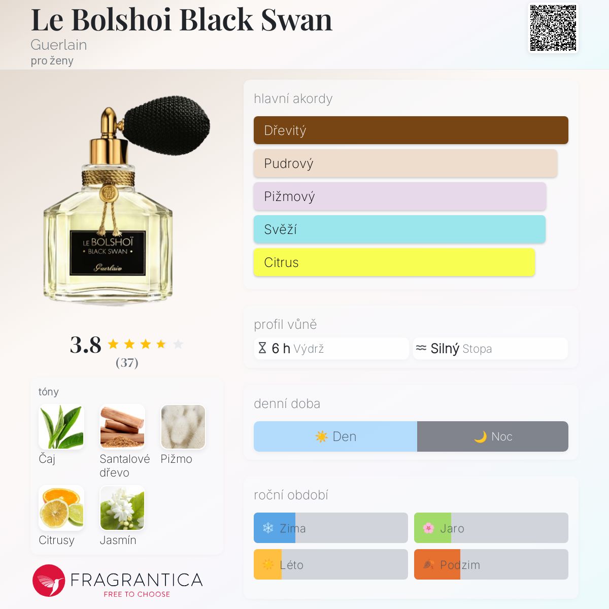 Le Bolshoi Black Swan podle Guerlain je Floral Woody Musk vůně pro ženy. Le Bolshoi Black Swan byl/a uveden/a v roce 2014. Vrchní tón je Citrusy ; střední tóny jsouČaj, Santalové dřevo a Jasmín ; základní tón je Bílé pižmo.
