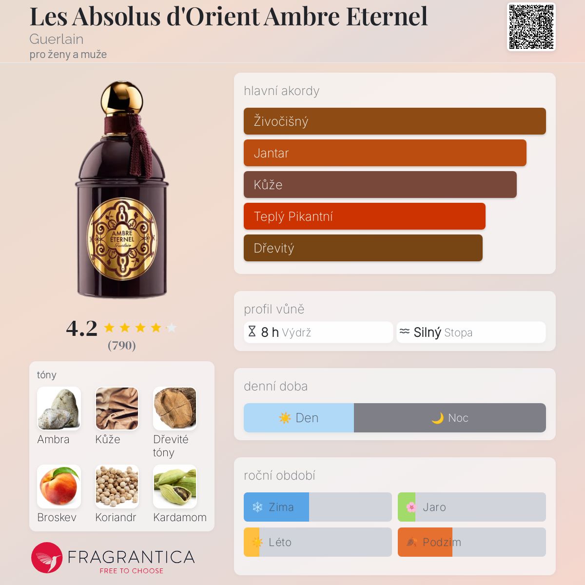 Les Absolus d'Orient Ambre Eternel podle Guerlain je Orientální Woody vůně pro ženy a muže. Les Absolus d'Orient Ambre Eternel byl/a uveden/a v roce 2016. "Nosem" za touto vůní je Thierry Wasser. Vrchní tóny jsou Ambra, Koriandr, Kardamom a Skořice; střední tóny jsouBroskev, Ylang-Ylang a Pomerančový květ ; základní tóny jsou Kůže a Dřevité tóny.