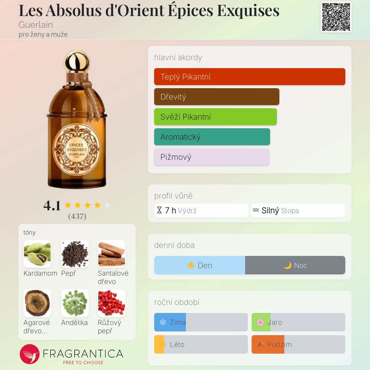 Les Absolus d'Orient Épices Exquises podle Guerlain je Orientální Spicy vůně pro ženy a muže. Les Absolus d'Orient Épices Exquises byl/a uveden/a v roce 2022. "Nosem" za touto vůní je Thierry Wasser. Vrchní tóny jsou Kardamom, Andělika a Růžový pepř; střední tóny jsouČerný pepř a Káva ; základní tóny jsou Santalové dřevo, Agarové dřevo (oud) a Pačuli.