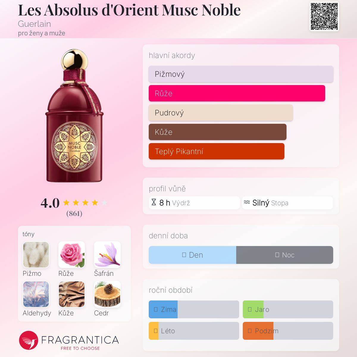 Les Absolus d'Orient Musc Noble podle Guerlain je Woody Floral Musk vůně pro ženy a muže. Les Absolus d'Orient Musc Noble byl/a uveden/a v roce 2018. "Nosem" za touto vůní je Thierry Wasser. Vrchní tóny jsou Šafrán, Aldehydy a Růžový pepř; střední tóny jsouPižmo, Růže a Pelargónie ; základní tóny jsou Bílé pižmo, Kůže, Cedr, Bílý jantar (ambra), Orris a Labdanum.
