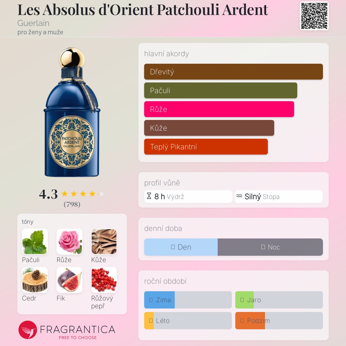 Les Absolus d'Orient Patchouli Ardent podle Guerlain je Woody Floral Musk vůně pro ženy a muže. Les Absolus d'Orient Patchouli Ardent byl/a uveden/a v roce 2020. "Nosem" za touto vůní je Thierry Wasser. Vrchní tóny jsou Fík, Růžový pepř a Černý pepř; střední tóny jsouPačuli, Turecká růže a Cedr ; základní tóny jsou Kůže a Pižmo.