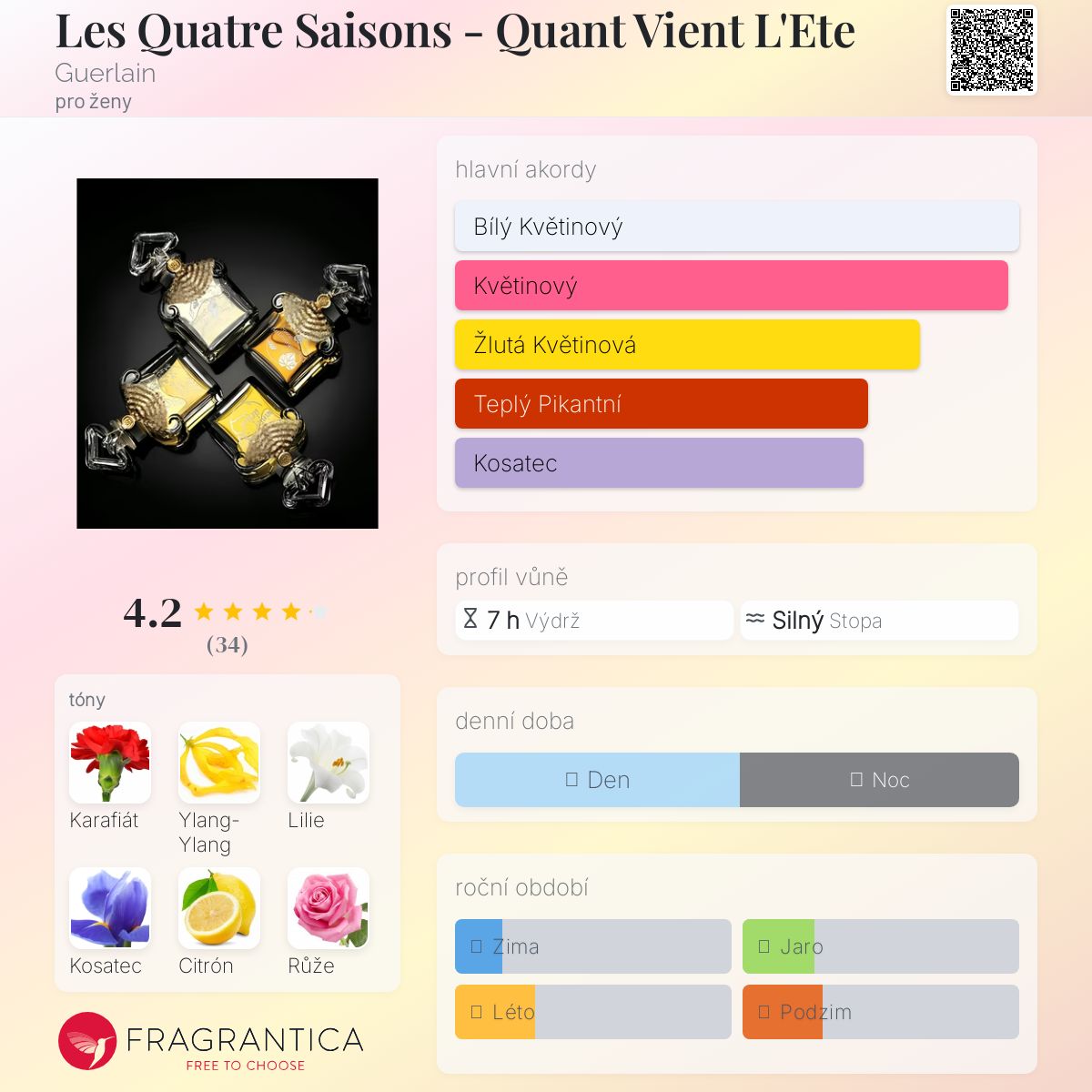 Les Quatre Saisons - Quant Vient L'Ete podle Guerlain je Floral vůně pro ženy. Les Quatre Saisons - Quant Vient L'Ete byl/a uveden/a v roce 2008. Vrchní tóny jsou Citrón, Růže a Máta; střední tóny jsouYlang-Ylang, Lilie a Jasmín ; základní tóny jsou Karafiát, Kosatec a Vanilka.
