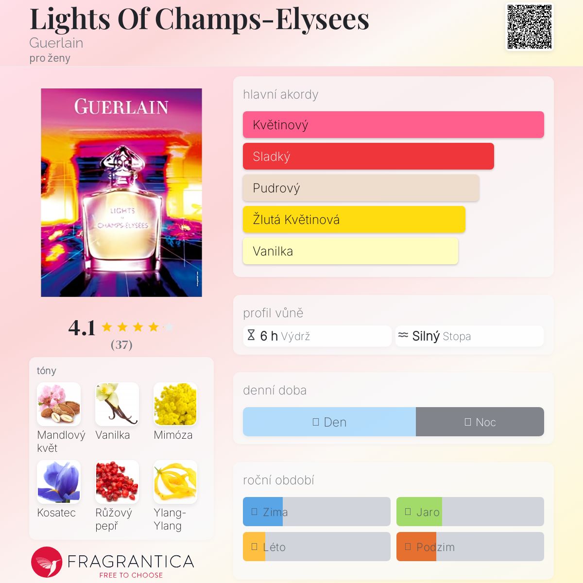Lights Of Champs-Elysees podle Guerlain je Floral vůně pro ženy. Lights Of Champs-Elysees byl/a uveden/a v roce 2006. Vrchní tóny jsou Mandlový květ , Pepř růžový a Růžový pepř; střední tóny jsouMimóza, Kosatec a Ylang-Ylang ; základní tóny jsou Vanilka, Virginský cedr a Vetiver.