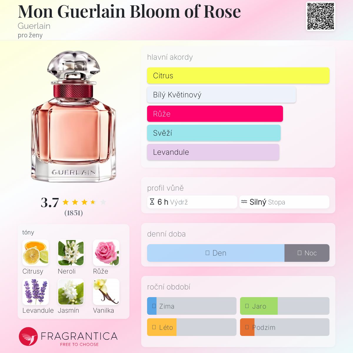 Mon Guerlain Bloom of Rose podle Guerlain je Floral vůně pro ženy. Mon Guerlain Bloom of Rose byl/a uveden/a v roce 2019. Mon Guerlain Bloom of Rose byl/a vytvořen/a Thierry Wasser a Delphine Jelk. Vrchní tóny jsou Citrusy a Levandule; střední tóny jsouNeroli, Bulharská růže a Jasmín Sambac ; základní tóny jsou Tahitská vanilka a Santalové dřevo.