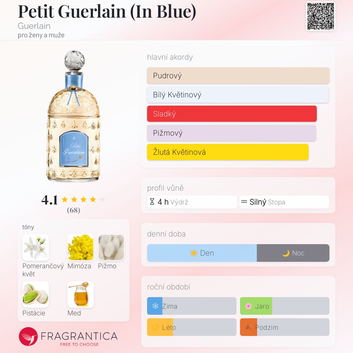 Petit Guerlain (In Blue) podle Guerlain je Orientální Floral vůně pro ženy a muže. Petit Guerlain (In Blue) byl/a uveden/a v roce 2014. "Nosem" za touto vůní je Thierry Wasser. Vrchní tón je Pomerančový květ ; střední tóny jsouMimóza a Med ; základní tóny jsou Bílé pižmo a Pistácie.