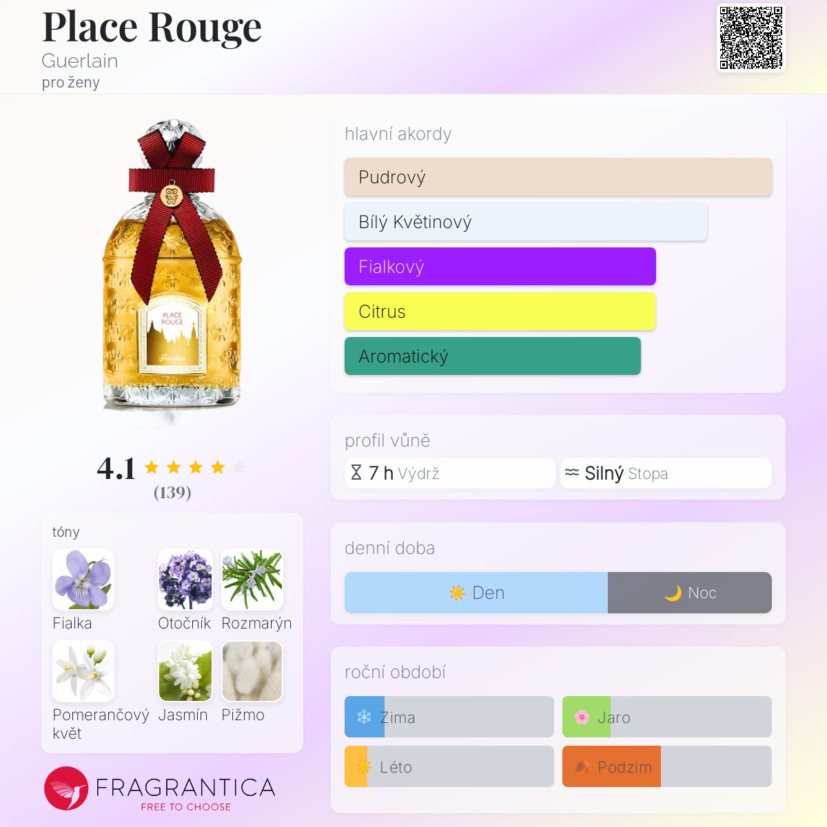 Place Rouge podle Guerlain je Chypre Floral vůně pro ženy. Place Rouge byl/a uveden/a v roce 2013. "Nosem" za touto vůní je Thierry Wasser. Vrchní tóny jsou Rozmarýn, Pomerančový květ a Bergamot; střední tóny jsouFialka, Otočník a Jasmín ; základní tóny jsou Bílé pižmo a Pačuli.