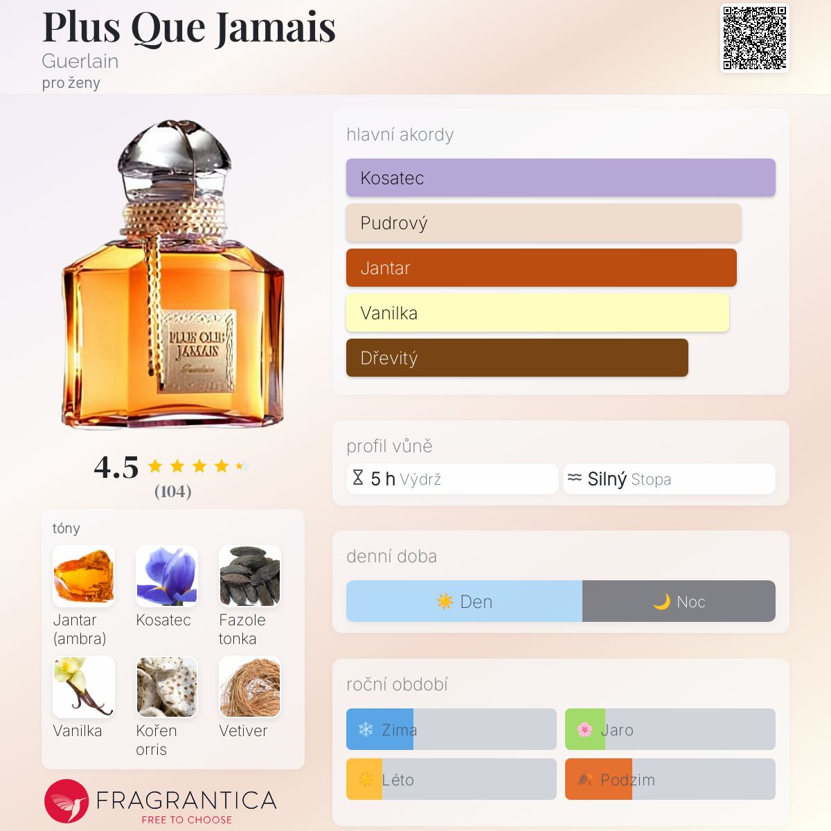 Plus Que Jamais podle Guerlain je Orientální Floral vůně pro ženy. Plus Que Jamais byl/a uveden/a v roce 2005. "Nosem" za touto vůní je Jean-Paul Guerlain. Vrchní tóny jsou Ylang-Ylang, Aldehydy, Neroli a Bergamot; střední tóny jsouKosatec, Kořen orris a Jasmín ; základní tóny jsou Jantar (ambra), Fazole tonka, Vanilka a Vetiver.
