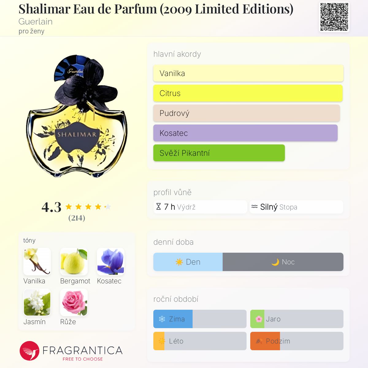 Shalimar Eau de Parfum (2009 Limited Editions) podle Guerlain je Floral vůně pro ženy. Shalimar Eau de Parfum (2009 Limited Editions) byl/a uveden/a v roce 2009. Vrchní tón je Bergamot ; střední tóny jsouKosatec, Jasmín a Růže ; základní tón je Vanilka.