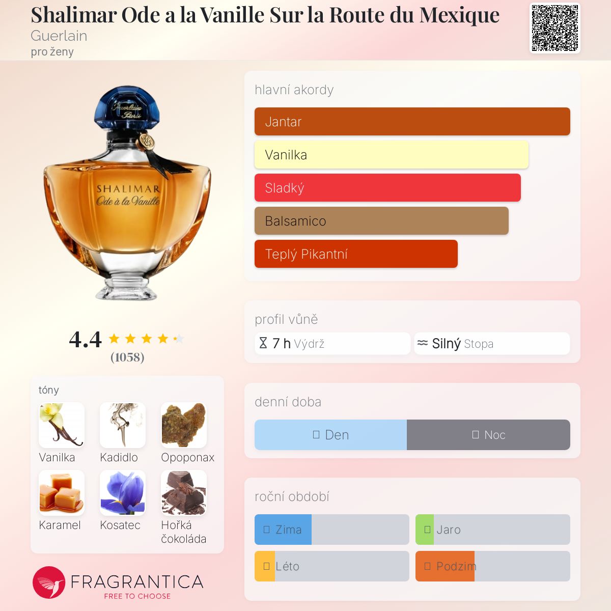 Shalimar Ode a la Vanille Sur la Route du Mexique podle Guerlain je Orientální Vanilla vůně pro ženy. Shalimar Ode a la Vanille Sur la Route du Mexique byl/a uveden/a v roce 2013. "Nosem" za touto vůní je Thierry Wasser.