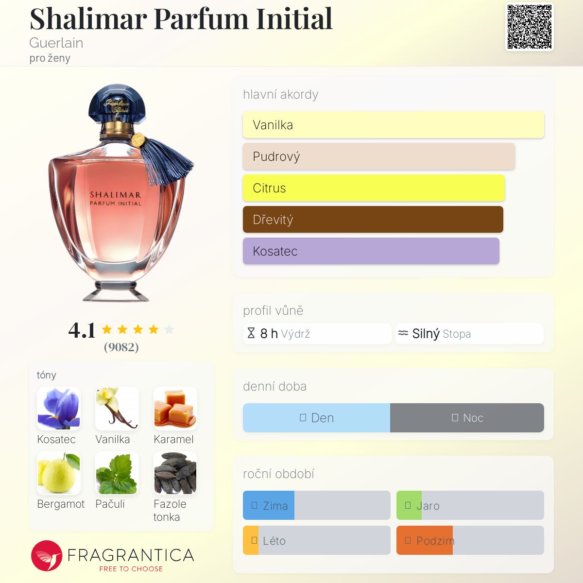 Shalimar Parfum Initial podle Guerlain je Chypre Floral vůně pro ženy. Shalimar Parfum Initial byl/a uveden/a v roce 2011. "Nosem" za touto vůní je Thierry Wasser. Vrchní tóny jsou Bergamot, Pomeranč a Zelené tóny; střední tóny jsouKosatec, Pačuli, Vetiver, Růže a Jasmín ; základní tóny jsou Vanilka, Karamel, Fazole tonka a Pižmo.