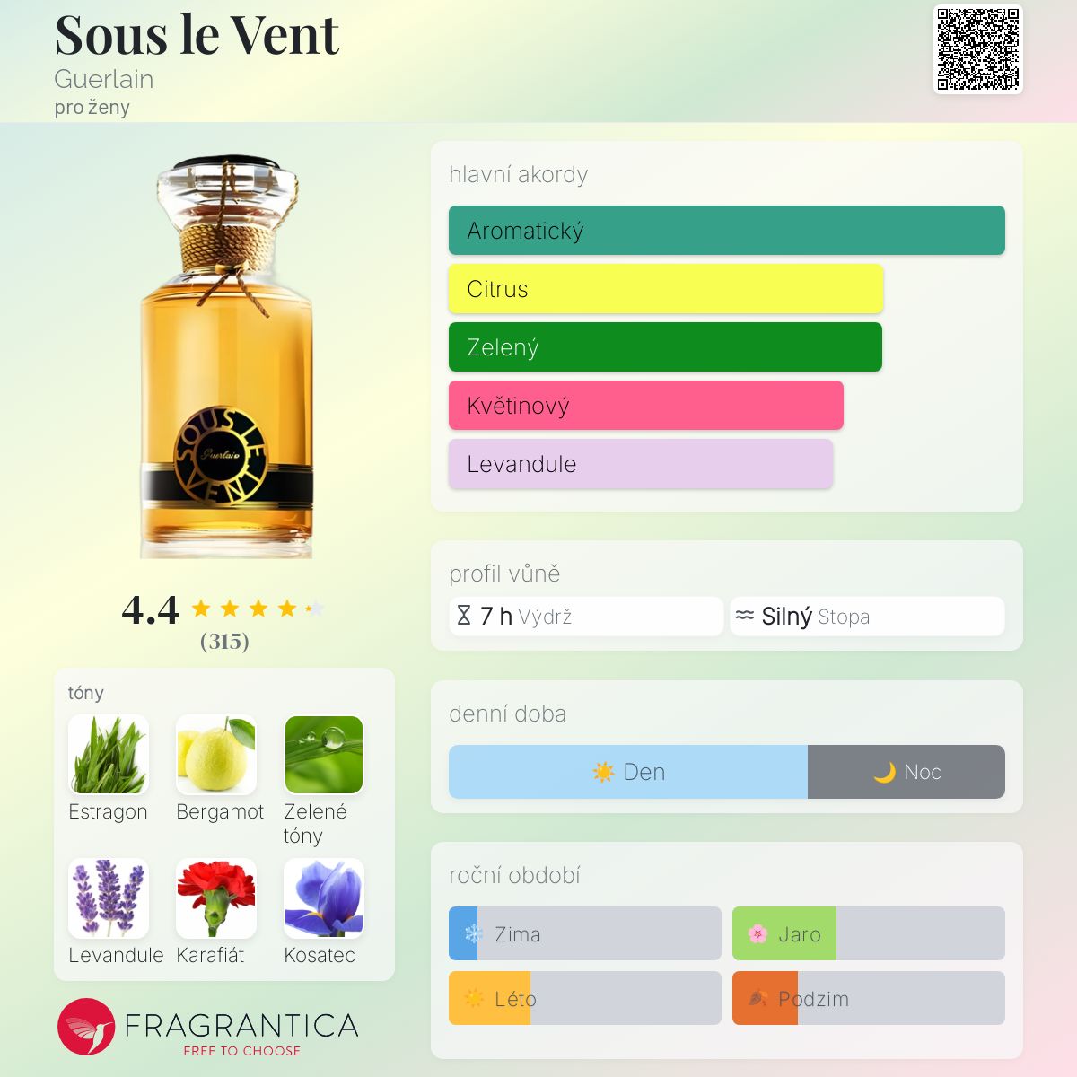 Sous le Vent podle Guerlain je Chypre Floral vůně pro ženy. Sous le Vent byl/a uveden/a v roce 1933. "Nosem" za touto vůní je Jacques Guerlain. Vrchní tóny jsou Estragon, Bergamot a Levandule; střední tóny jsouZelené tóny, Karafiát a Jasmín ; základní tóny jsou Kosatec a Dřevité tóny.