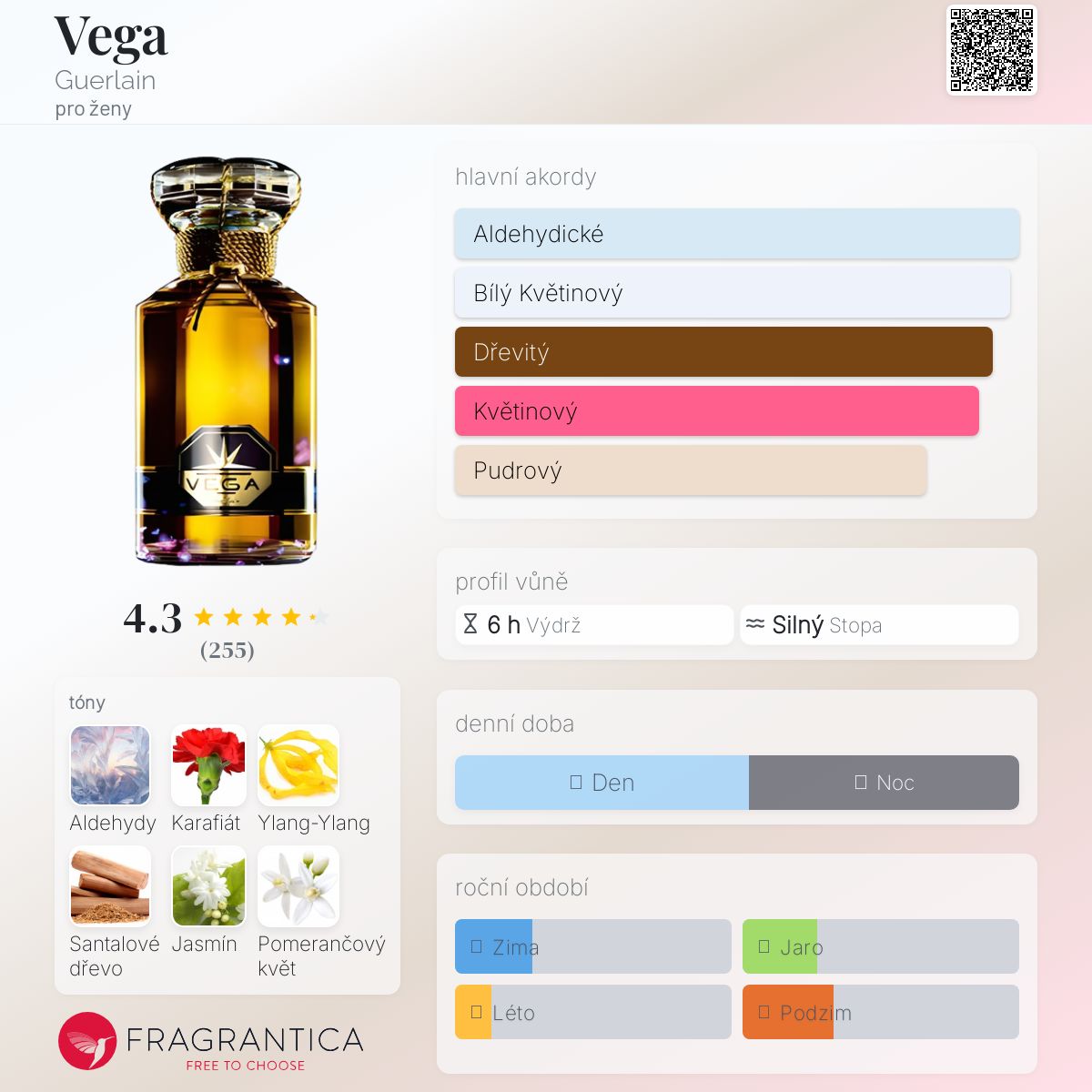 Vega podle Guerlain je Floral Aldehyde vůně pro ženy. Vega byl/a uveden/a v roce 1936. "Nosem" za touto vůní je Jacques Guerlain. Vrchní tóny jsou Aldehydy, Květ afrického pomeranče a Bergamot; střední tóny jsouKarafiát, Ylang-Ylang, Jasmín, Růže a Kosatec ; základní tóny jsou Santalové dřevo, Vanilka a Jantar (ambra).