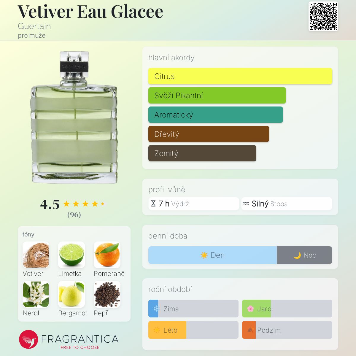 Vetiver Eau Glacee podle Guerlain je Aromatic Fougere vůně pro muže. Vetiver Eau Glacee byl/a uveden/a v roce 2004. "Nosem" za touto vůní je Jean-Paul Guerlain. Vrchní tóny jsou Limetka, Pomeranč a Bergamot; střední tóny jsouNeroli, Pepř a Muškátový oříšek ; základní tóny jsou Vetiver a Fazole tonka.