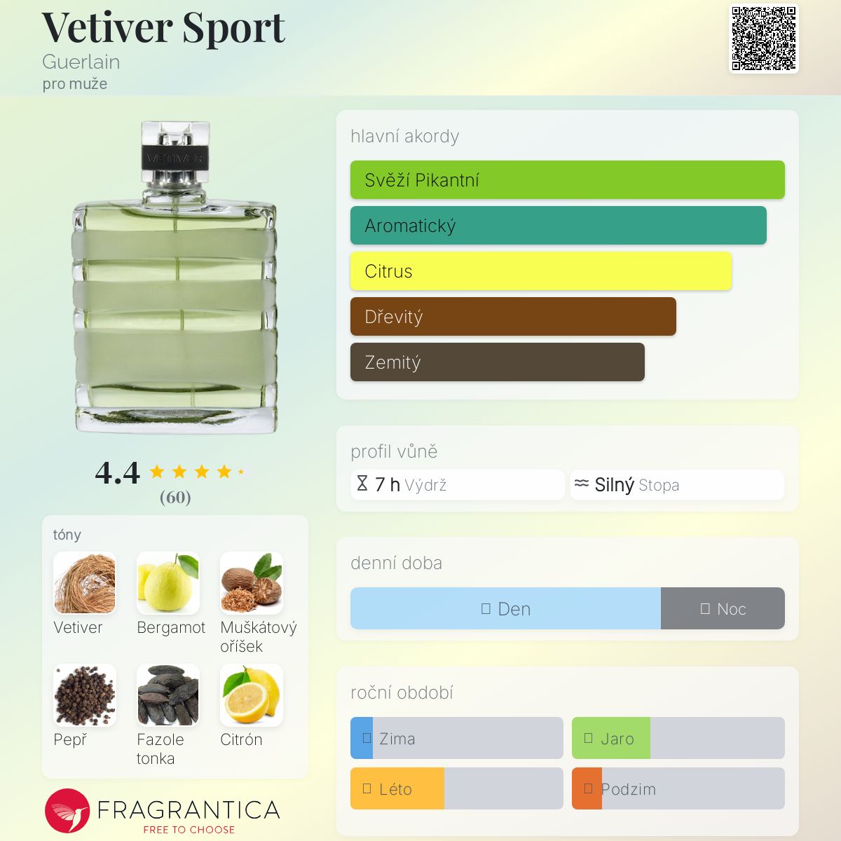 Vetiver Sport podle Guerlain je Woody Spicy vůně pro muže. Vetiver Sport byl/a uveden/a v roce 2006. Vrchní tóny jsou Bergamot a Citrón; střední tóny jsouMuškátový oříšek a Pepř ; základní tóny jsou Vetiver a Fazole tonka.