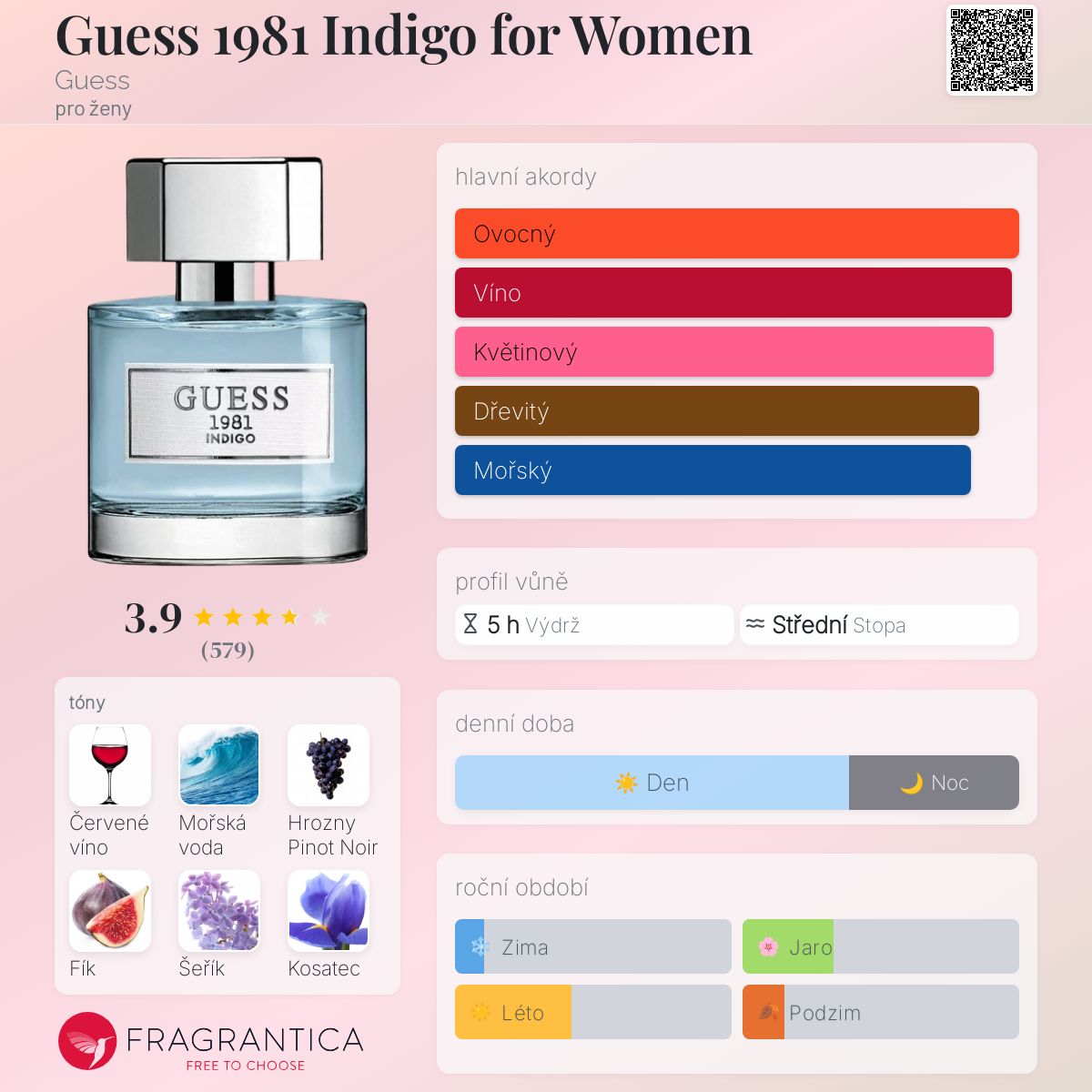 Guess 1981 Indigo for Women podle Guess je Floral Aquatic vůně pro ženy. Guess 1981 Indigo for Women byl/a uveden/a v roce 2018. Vrchní tóny jsou Mořské tóny, Fík a Šeřík; střední tóny jsouKosatec, Modrý lotos a Narcis ; základní tóny jsou Červené víno, Hrozny Pinot Noir, Atlasový cedr a Haitský vetiver.