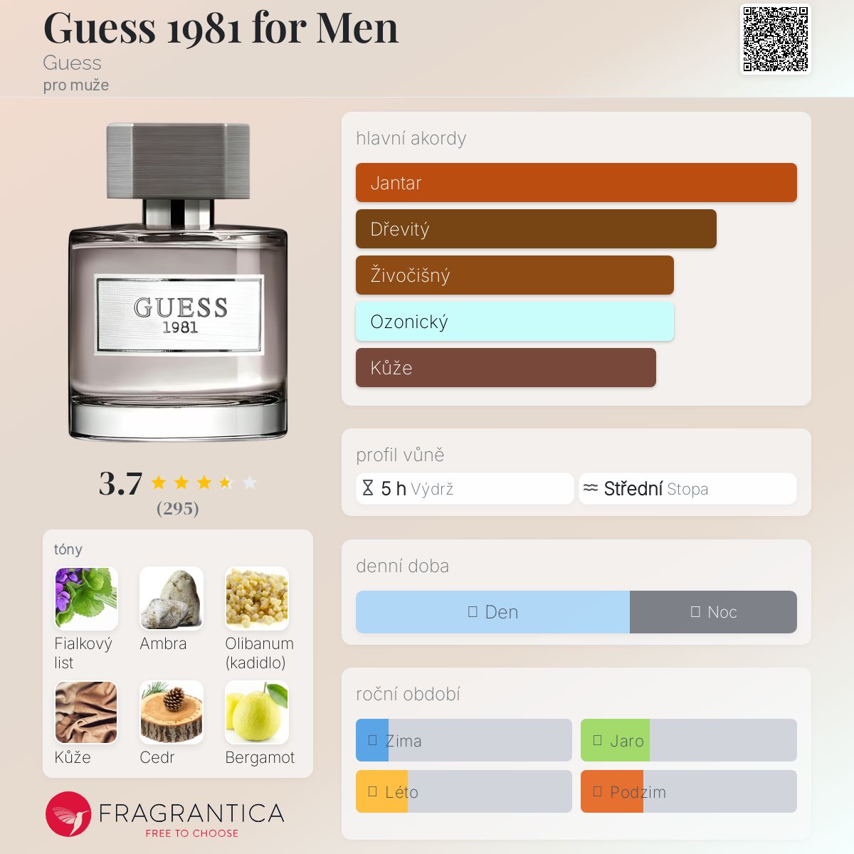 Guess 1981 for Men podle Guess je Woody Chypre vůně pro muže. Guess 1981 for Men byl/a uveden/a v roce 2017. Vrchní tóny jsou Fialkový list a Bergamot; střední tóny jsouAmbra, Cedr a Dubový mech ; základní tóny jsou Olibanum a Kůže.