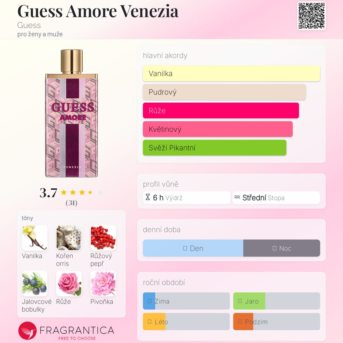 Guess Amore Venezia podle Guess je Orientální Floral vůně pro ženy a muže. Toto je nová vůně. Guess Amore Venezia byl/a uveden/a v roce 2024. Vrchní tóny jsou Růžový pepř, Jalovcové bobulky a Kalábrijský bergamot; střední tóny jsouOrris, Květná růže a Pivoňka ; základní tóny jsou Vanilka, Olibanum a Semiš.