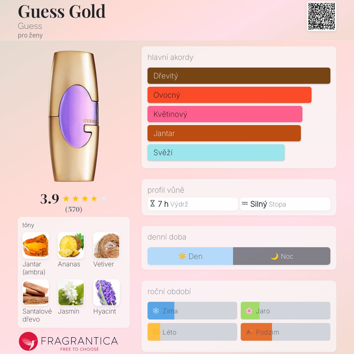 Guess Gold podle Guess je Floral Fruity vůně pro ženy. Guess Gold byl/a uveden/a v roce 2007. "Nosem" za touto vůní je Claudette Belnavis. Vrchní tóny jsou Ananas, Jablko a Citrón; střední tóny jsouJasmín, Hyacint, Růže a Leknín ; základní tóny jsou Jantar (ambra), Vetiver a Santalové dřevo.