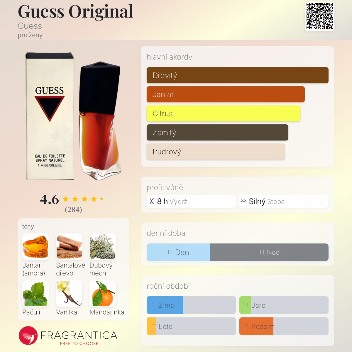 Guess Original podle Guess je Chypre Floral vůně pro ženy. Guess Original byl/a uveden/a v roce 1990. "Nosem" za touto vůní je James Bell. Vrchní tóny jsou Mandarinka, Černý rybíz, Grapefruit, Ylang-Ylang a Citron amalfi; střední tóny jsouKvět afrického pomeranče, Jasmín, Hyacint, Skořice, Kosatec a Konvalinka ; základní tóny jsou Jantar (ambra), Santalové dřevo, Dubový mech, Pačuli, Vanilka, Kořen orris, Benzoin a Labdanum.