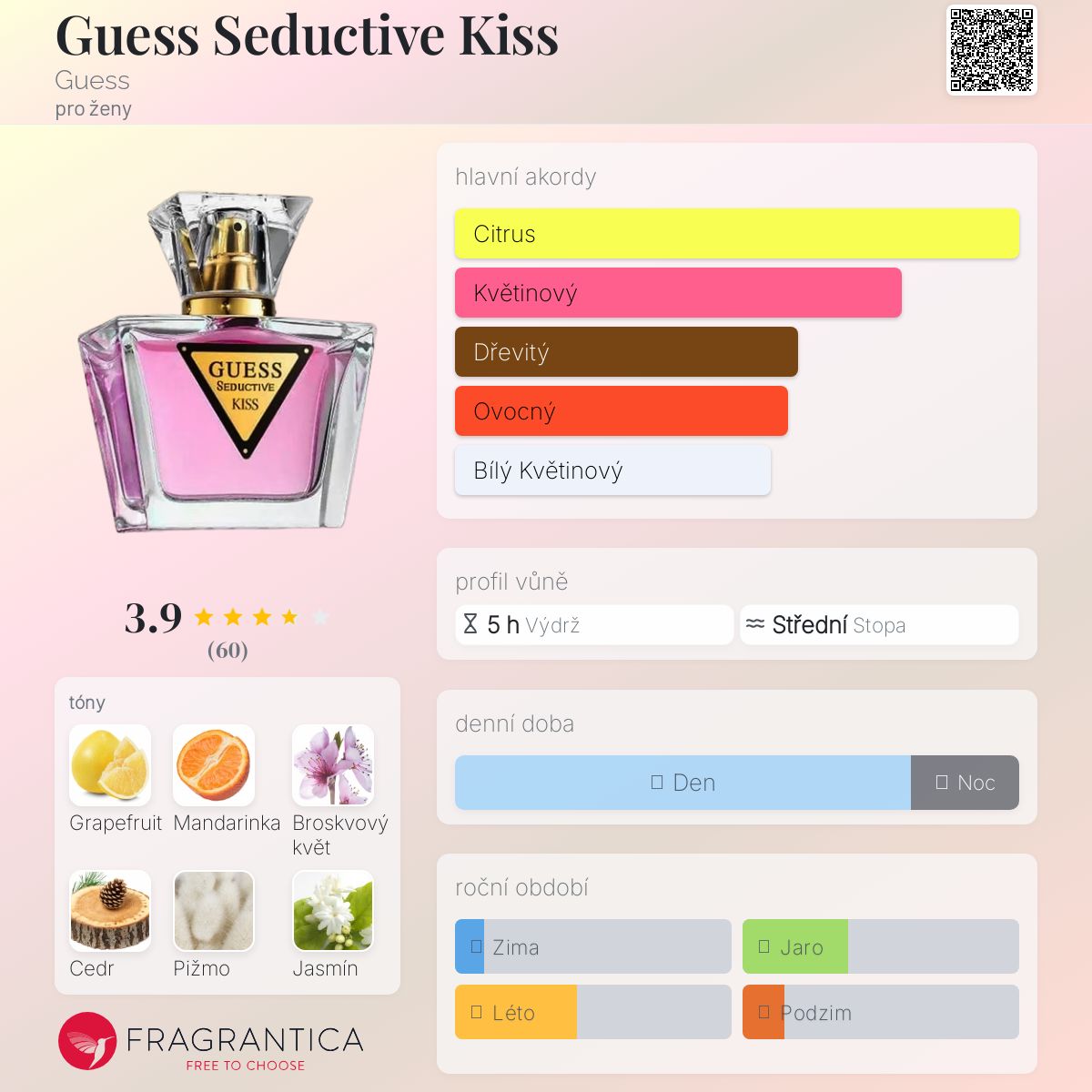 Guess Seductive Kiss podle Guess je Floral vůně pro ženy. Guess Seductive Kiss byl/a uveden/a v roce 2020. Vrchní tóny jsou Grapefruit a Mandarinka; střední tóny jsouBroskvový květ, Jasmín a Polní květiny ; základní tóny jsou Cedr, Pižmo a Jantar (ambra).