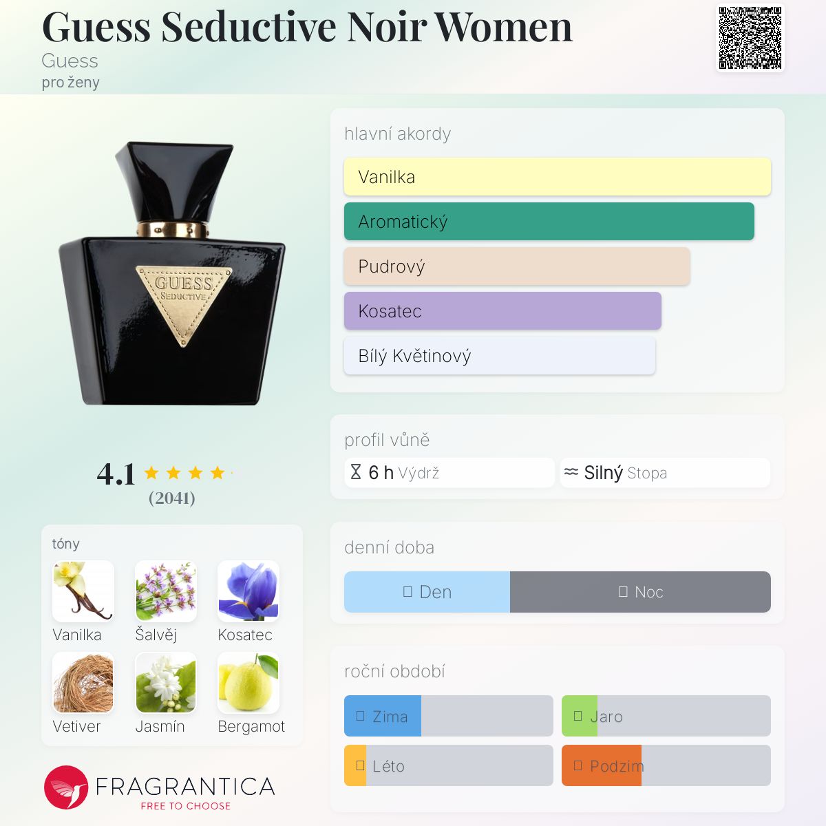 Guess Seductive Noir Women podle Guess je Orientální Floral vůně pro ženy. Guess Seductive Noir Women byl/a uveden/a v roce 2019. "Nosem" za touto vůní je Laurent Le Guernec. Vrchní tóny jsou Šalvěj, Bergamot a Pivoňka; střední tóny jsouKosatec, Jasmín Sambac a Konvalinka ; základní tóny jsou Vanilka, Haitský vetiver a Semiš.