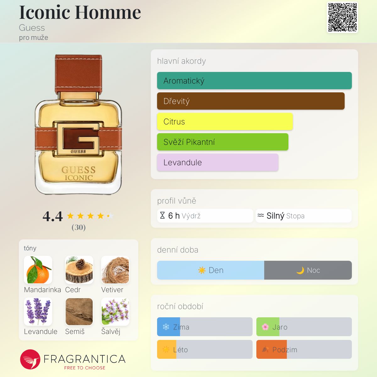 Iconic Homme podle Guess je Woody Aromatic vůně pro muže. Toto je nová vůně. Iconic Homme byl/a uveden/a v roce 2025. Iconic Homme byl/a vytvořen/a Gino Percontino a Claude Dir. Vrchní tóny jsou Mandarinka, Cedr a Pepř; střední tóny jsouLevandule, Šalvěj, Maté a Pelargónie ; základní tóny jsou Vetiver, Semiš, Labdanum a Pepř.
