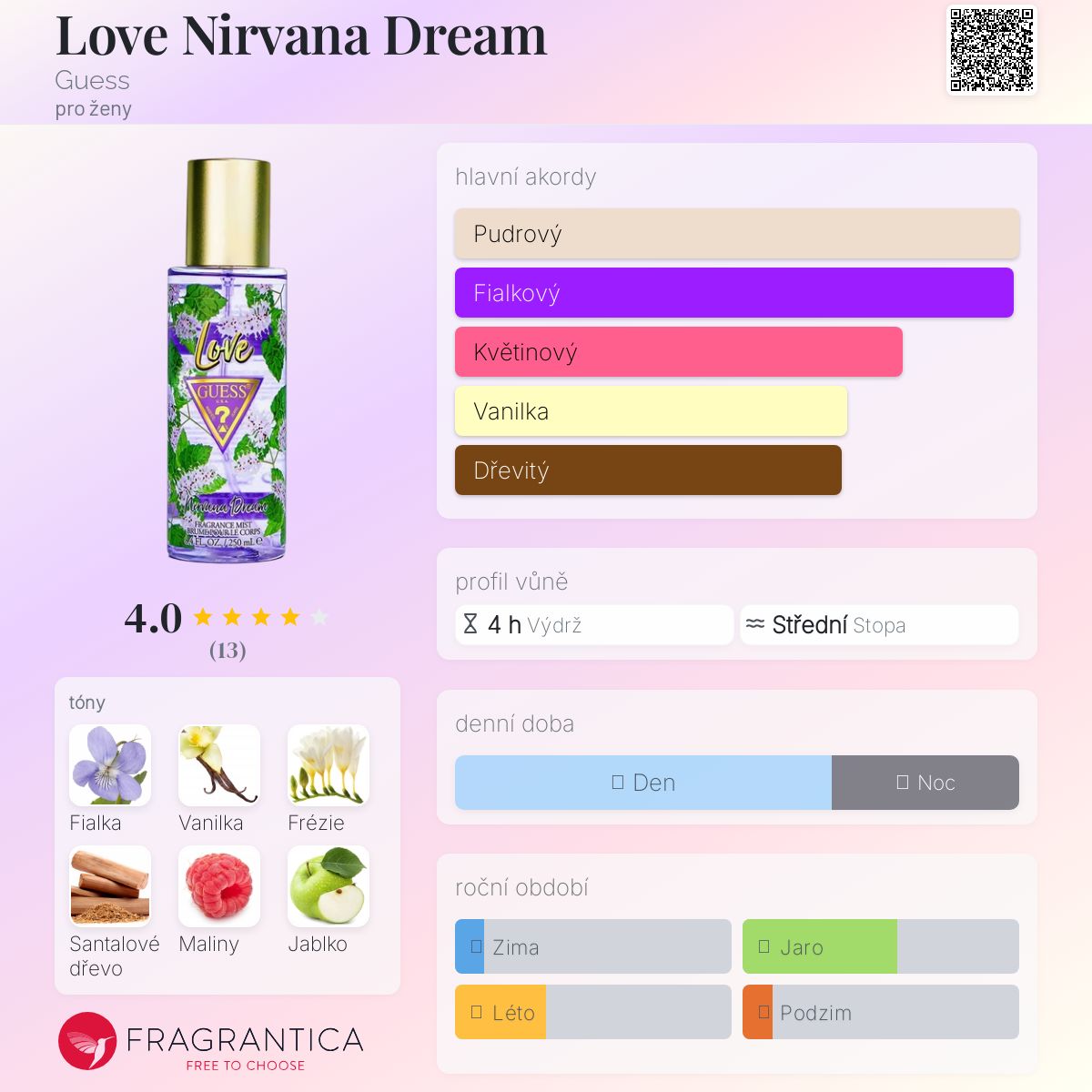 Love Nirvana Dream podle Guess je Floral Fruity Gourmand vůně pro ženy. Love Nirvana Dream byl/a uveden/a v roce 2022. Vrchní tóny jsou Maliny, Jablko a Švestka; střední tóny jsouFialka, Frézie a Jasmín ; základní tóny jsou Vanilka, Santalové dřevo a Ambra.