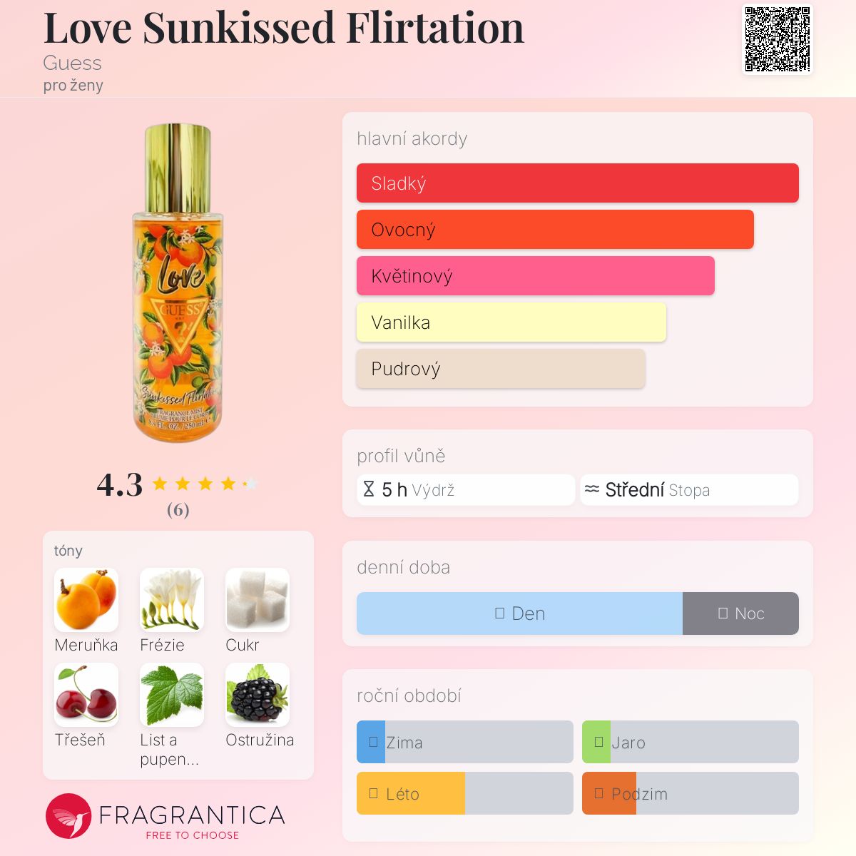 Love Sunkissed Flirtation podle Guess je vůně pro ženy. Love Sunkissed Flirtation byl/a uveden/a v roce 2022. Vrchní tóny jsou Meruňka, Třešeň a Černý rybíz; střední tóny jsouFrézie, Ostružina a Lilie ; základní tóny jsou Cukr, Santalové dřevo, Vanilka a Jantar (ambra).