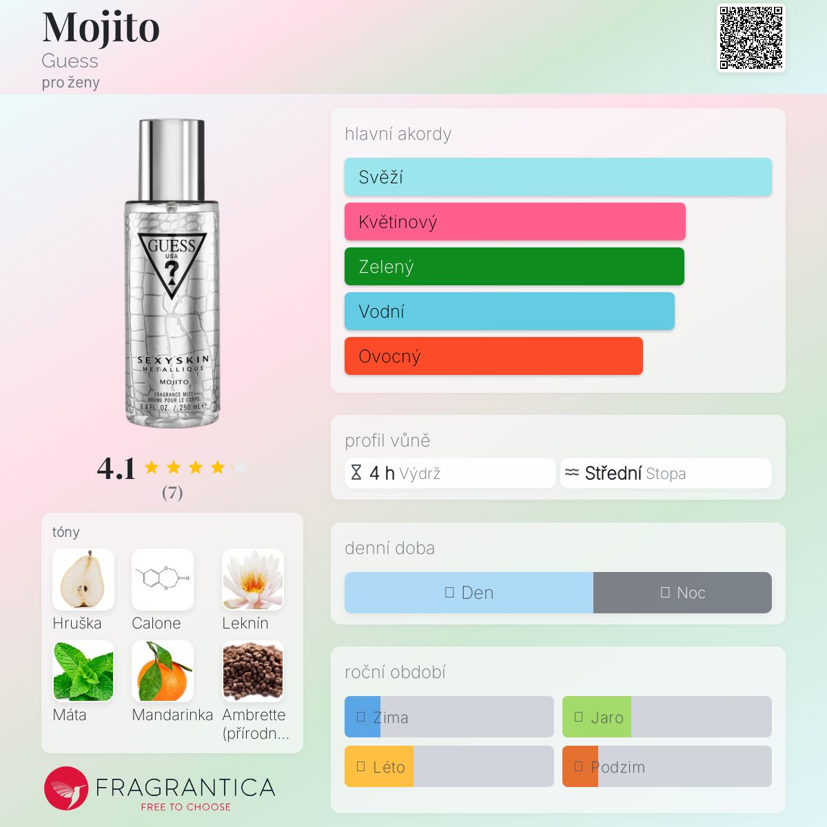 Mojito podle Guess je Floral Fruity vůně pro ženy. Toto je nová vůně. Mojito byl/a uveden/a v roce 2024. Vrchní tóny jsou Hruška, Calone a Mandarinka; střední tóny jsouLeknín, Máta a Jasmín ; základní tóny jsou Ambrette (přírodní pižmo), Cedr a Santalové dřevo.