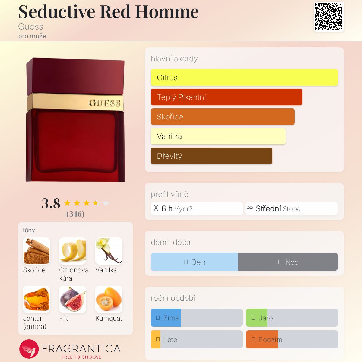 Seductive Red Homme podle Guess je Orientální Vanilla vůně pro muže. Seductive Red Homme byl/a uveden/a v roce 2021. Vrchní tóny jsou Skořice, Citrónová kůra a Fík; střední tóny jsouKumquat, Pomerančový květ a Pelargónie ; základní tóny jsou Vanilka, Jantar (ambra) a Santalové dřevo.