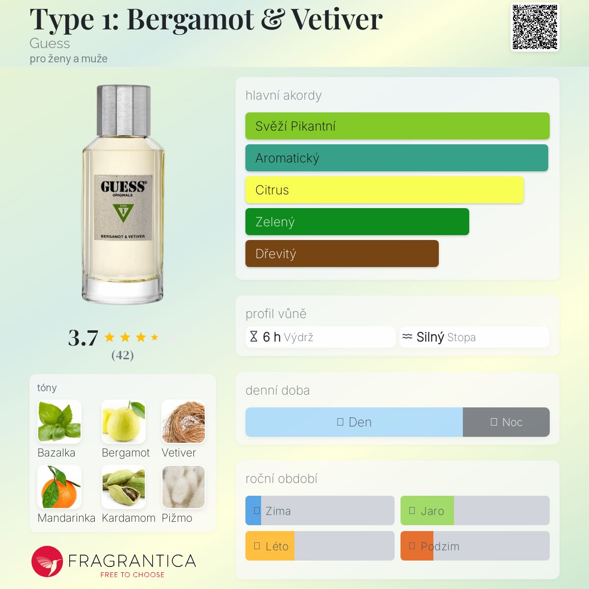 Type 1: Bergamot & Vetiver podle Guess je vůně pro ženy a muže. Type 1: Bergamot & Vetiver byl/a uveden/a v roce 2023. Vrchní tóny jsou Bazalka, Bergamot a Mandarinka; střední tóny jsouKardamom, Kosatec a Lilie ; základní tóny jsou Vetiver, Pižmo a Pačuli.