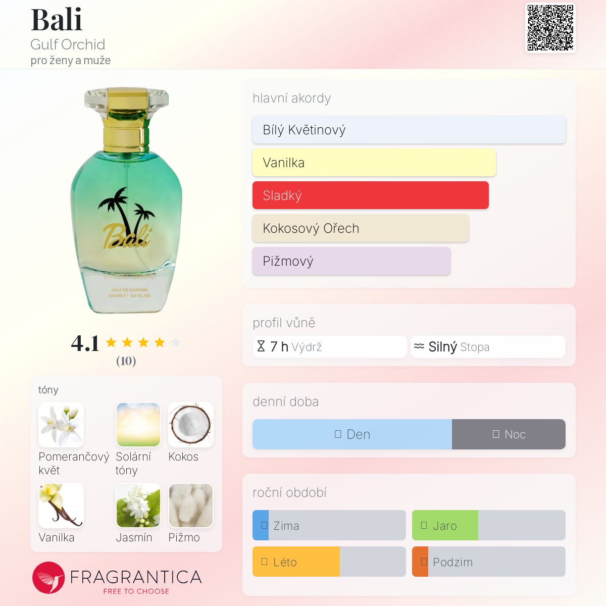 Bali podle Gulf Orchid je Floral Fruity vůně pro ženy a muže. Toto je nová vůně. Bali byl/a uveden/a v roce 2024. Vrchní tóny jsou Kokos, Mučenka a Mango; střední tóny jsouPomerančový květ, Solární tóny a Jasmín ; základní tóny jsou Vanilka, Pižmo a Kašmírové dřevo.