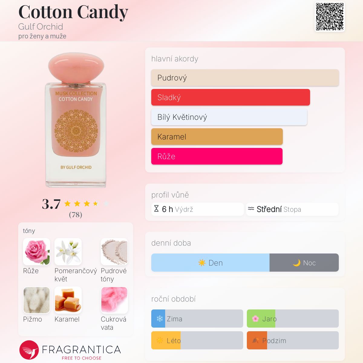 Cotton Candy podle Gulf Orchid je Orientální Floral vůně pro ženy a muže. Toto je nová vůně. Cotton Candy byl/a uveden/a v roce 2025. Vrchní tóny jsou Růže, Cukrová vata, Konvalinka a Neroli; střední tóny jsouRůže, Pomerančový květ, Pižmo, Fialka a Marshmallow ; základní tóny jsou Pudrové tóny, Pižmo, Karamel, Jantar (ambra) a Mléko.