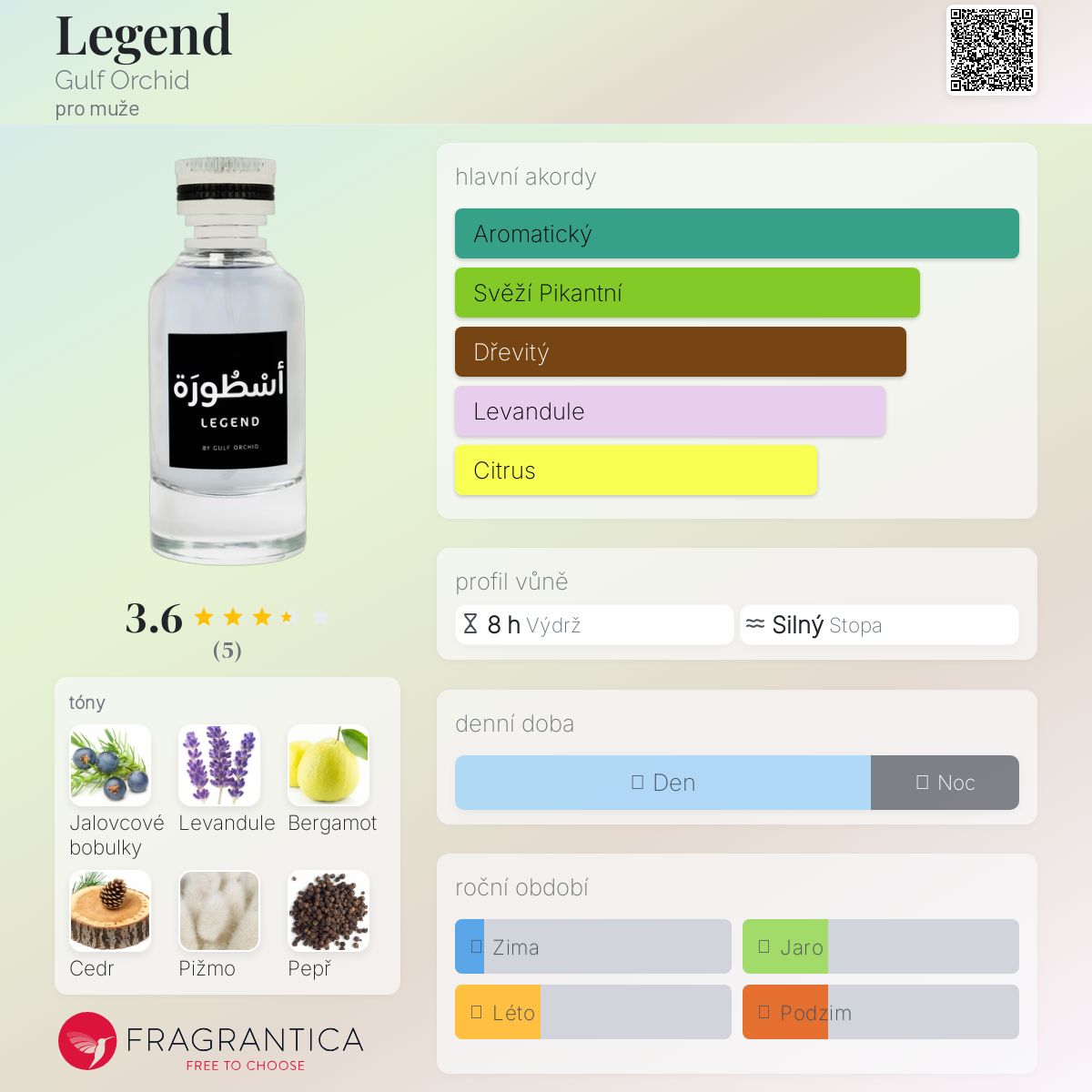 Legend podle Gulf Orchid je Woody Aromatic vůně pro muže. Legend byl/a uveden/a v roce 2022. Vrchní tóny jsou Bergamot a Pepř; střední tóny jsouJalovcové bobulky, Levandule a Kašmír ; základní tóny jsou Cedr, Pižmo a Jantar (ambra).