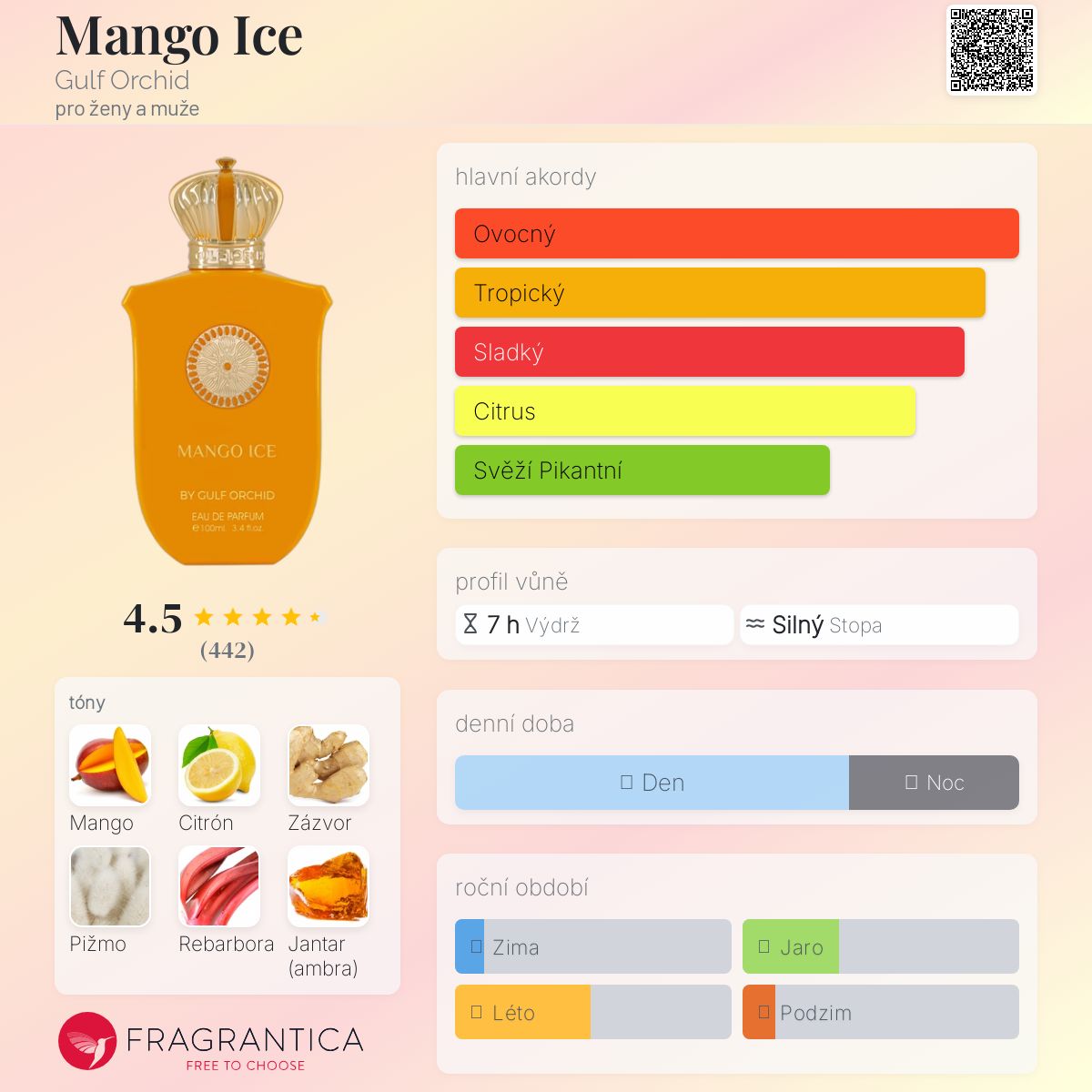 Mango Ice podle Gulf Orchid je Aromatic Fruity vůně pro ženy a muže. Toto je nová vůně. Mango Ice byl/a uveden/a v roce 2025. Vrchní tóny jsou Mango, Citrón, Zázvor a Rebarbora; střední tóny jsouJantar (ambra), Bílé květy a Lékořice ; základní tóny jsou Pižmo, Vanilka, Karamel a Kaštan.