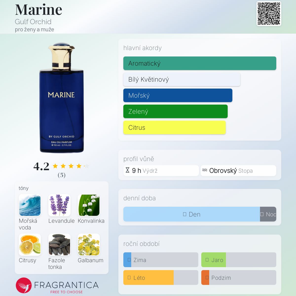 Marine podle Gulf Orchid je Woody Aromatic vůně pro ženy a muže. Toto je nová vůně. Marine byl/a uveden/a v roce 2024. Vrchní tóny jsou Vodní tóny, Levandule, Citrusy a Galbanum; střední tóny jsouKonvalinka, Pomerančový květ a Pelargónie ; základní tóny jsou Fazole tonka, Dubový mech, Vetiver a Pižmo.