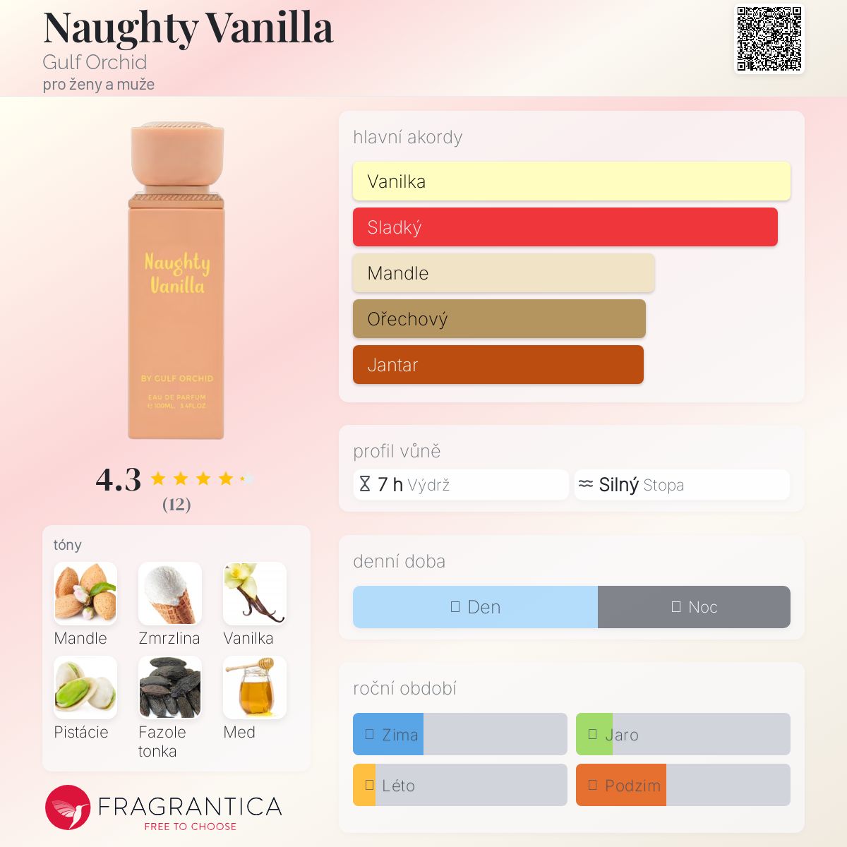 Naughty Vanilla podle Gulf Orchid je Orientální Vanilla vůně pro ženy a muže. Toto je nová vůně. Naughty Vanilla byl/a uveden/a v roce 2025. Vrchní tóny jsou Mandle, Med a Bergamot; střední tóny jsouZmrzlina, Pistácie a Pomerančový květ ; základní tóny jsou Vanilka, Fazole tonka a Jantar (ambra).