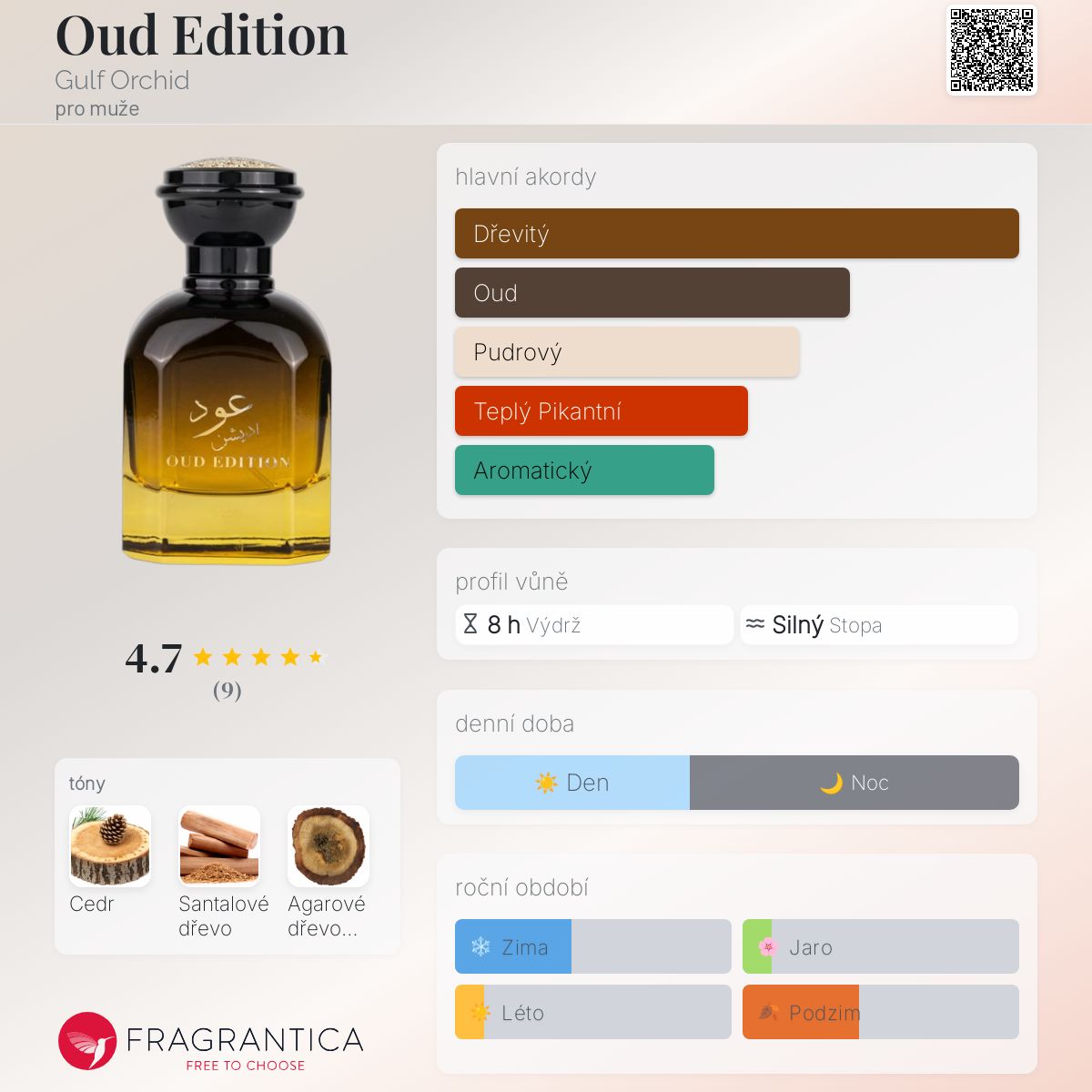 Oud Edition podle Gulf Orchid je Woody vůně pro muže. Oud Edition byl/a uveden/a v roce 2021. Vrchní tón je Cedr ; střední tón jeSantalové dřevo ; základní tón je Agarové dřevo (oud).