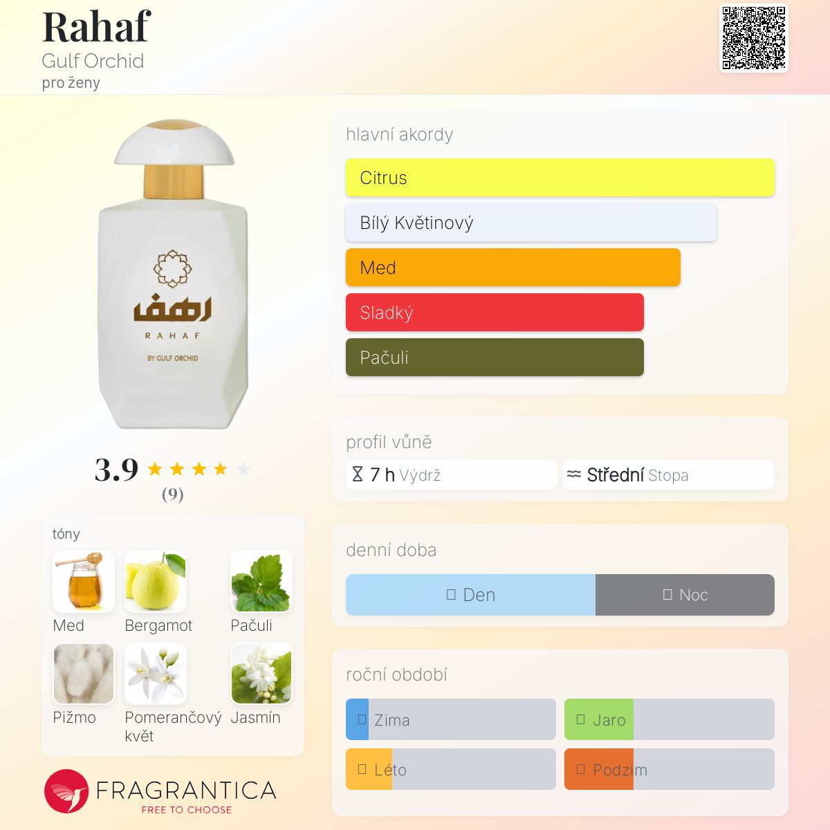Rahaf podle Gulf Orchid je Orientální Floral vůně pro ženy. Rahaf byl/a uveden/a v roce 2022. Vrchní tóny jsou Bergamot a Citrón; střední tóny jsouPomerančový květ, Jasmín a Růže ; základní tóny jsou Med, Pačuli a Pižmo.