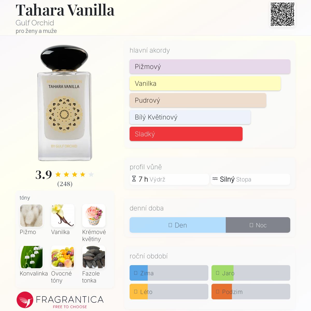 Tahara Vanilla podle Gulf Orchid je Floral Woody Musk vůně pro ženy a muže. Tahara Vanilla byl/a uveden/a v roce 2022. Vrchní tóny jsou Ovocné tóny a Zelené tóny; střední tóny jsouVanilka, Krémové květiny, Konvalinka a Jasmín ; základní tóny jsou Pižmo, Fazole tonka a Jantar (ambra).