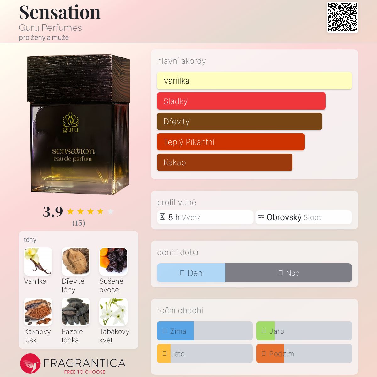 Sensation podle Guru Perfumes je Orientální Vanilla vůně pro ženy a muže. Sensation byl/a uveden/a v roce 2017. Vrchní tóny jsou Tabákový list a Kořeněné tóny; střední tóny jsouVanilka, Kakaový lusk, Fazole tonka a Tabákový květ ; základní tóny jsou Dřevité tóny a Sušené ovoce.
