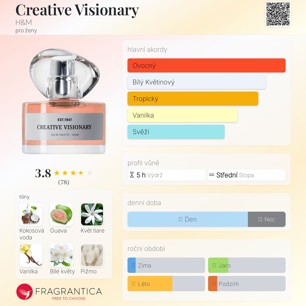Creative Visionary podle H&M je Floral Fruity vůně pro ženy. Toto je nová vůně. Creative Visionary byl/a uveden/a v roce 2024. Vrchní tóny jsou Kokosová voda a Guava; střední tóny jsouKvět tiare, Bílé květy a Fialka ; základní tóny jsou Vanilka, Pižmo a Pačuli.