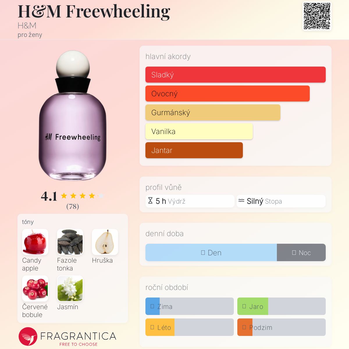 H&M Freewheeling podle H&M je Floral Fruity vůně pro ženy. H&M Freewheeling byl/a uveden/a v roce 2018. "Nosem" za touto vůní je Nisrine Bouazzaoui Grillié. Vrchní tóny jsou Sladké jablko a Hruška; střední tóny jsouČervené bobule a Jasmín ; základní tón je Fazole tonka.
