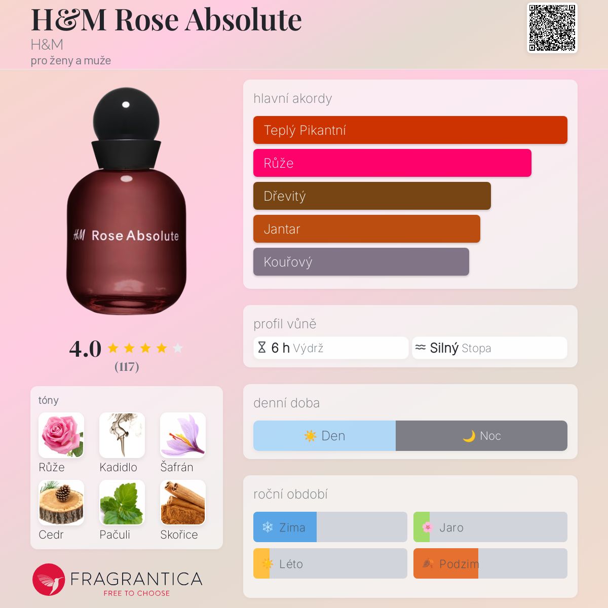H&M Rose Absolute podle H&M je Chypre Floral vůně pro ženy a muže. H&M Rose Absolute byl/a uveden/a v roce 2018. "Nosem" za touto vůní je Olivier Pescheux. Vrchní tóny jsou Šafrán, Skořice a Šalvěj muškátová; střední tóny jsouTurecká růže, Kosatec a Frézie ; základní tóny jsou Kadidlo, Cedr a Pačuli.