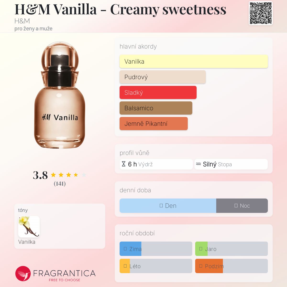 H&M Vanilla - Creamy sweetness podle H&M je Orientální vůně pro ženy a muže. H&M Vanilla - Creamy sweetness byl/a uveden/a v roce 2018. H&M Vanilla - Creamy sweetness byl/a vytvořen/a Olivier Pescheux a Nisrine Bouazzaoui Grillié.