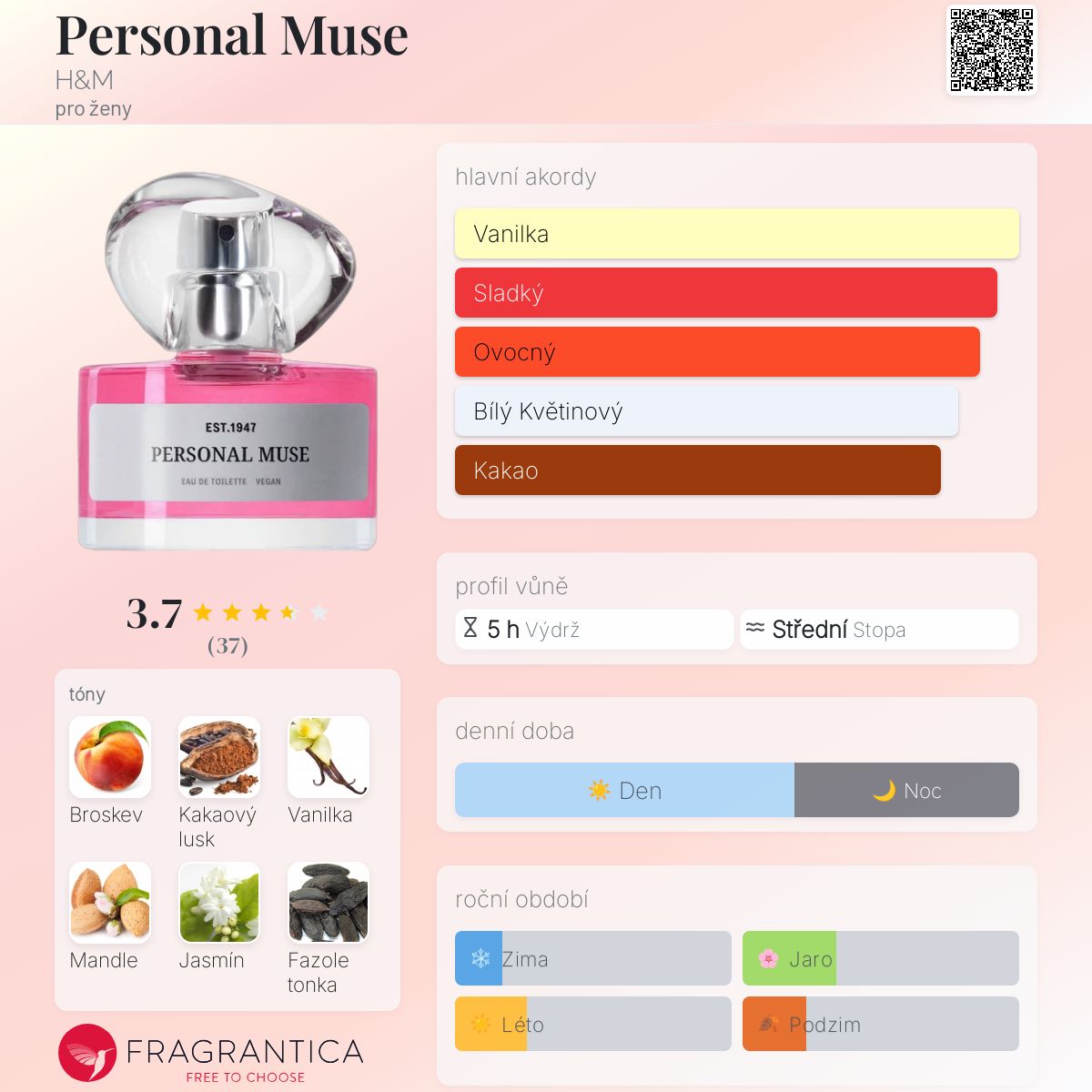 Personal Muse podle H&M je Floral vůně pro ženy. Personal Muse byl/a uveden/a v roce 2024. "Nosem" za touto vůní je Firmenich. Vrchní tóny jsou Broskev a Mandle; střední tóny jsouJasmín, Tuberóza a Kořen kosatce ; základní tóny jsou Kakao, Vanilka, Fazole tonka a Santalové dřevo.